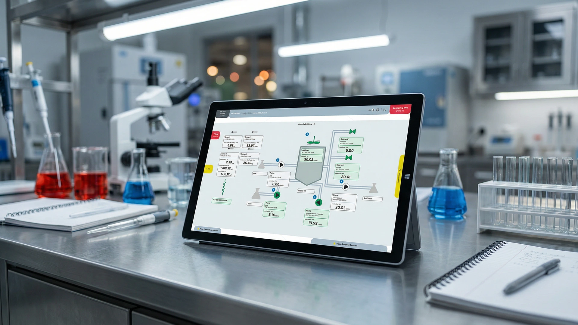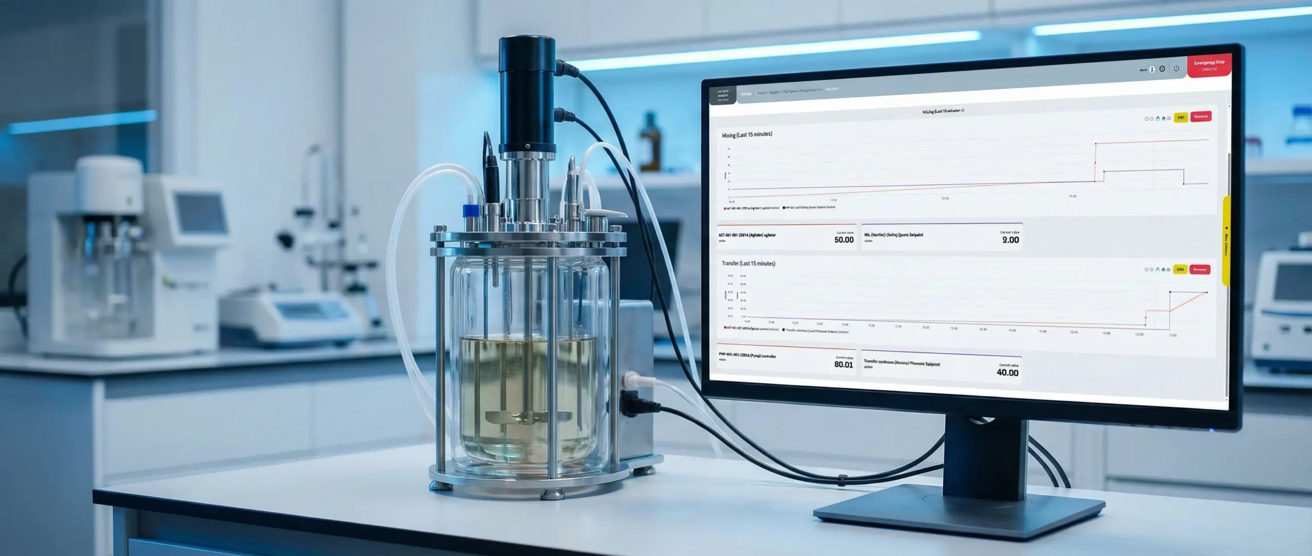 The client needed to integrate laboratory bioreactors into a single, centralized control system to eliminate fragmented data silos. The requirement was to manage a diverse laboratory and production setup, consisting of four control towers for glass-vessel bioreactors (ranging from 1L to 5L) and a large-scale 70L stainless steel bioreactor tower.